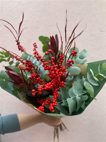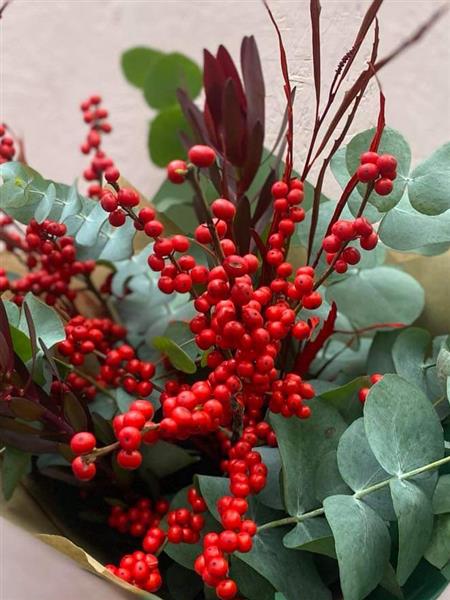 Ilex berries, eucalyptus, grevillea and sunset foliage is the way to go if you want to keep it natural. Handtied ready to be placed in their favourite vase.