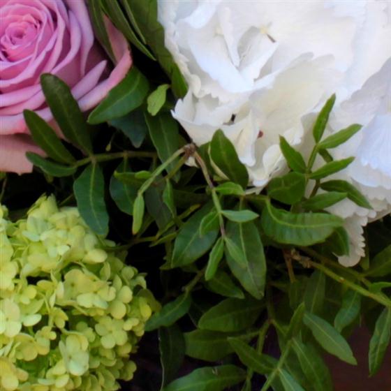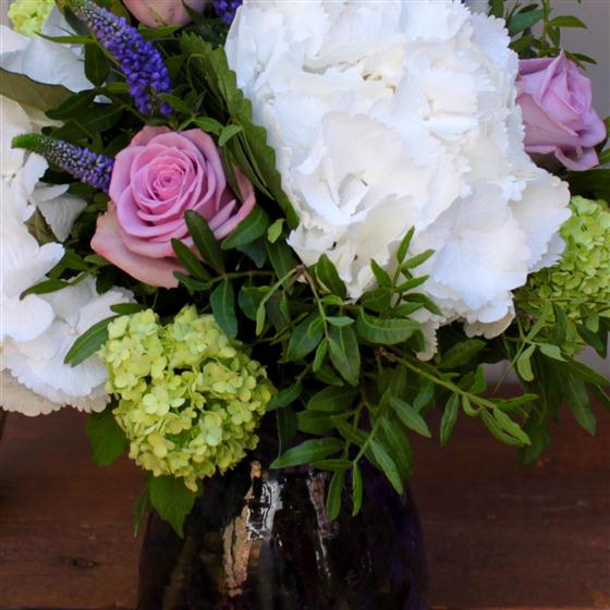Petite jar arrangement overflowing with white hydrangeas, lilac roses, veronica and seasonal foliage. A crisp and modern arrangement.