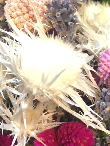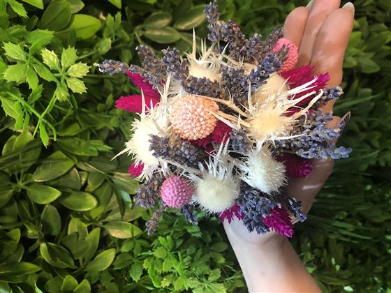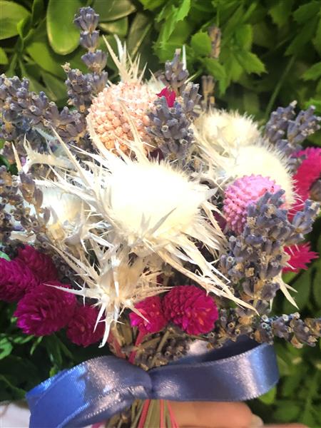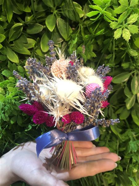 Dainty hand tied bunch which is just perfect for that “wee” gift. It is very cute, lasts forever and fits in the palm of your hand. Available in a full range of colours. Dressed in a co-ordinating ribbon.