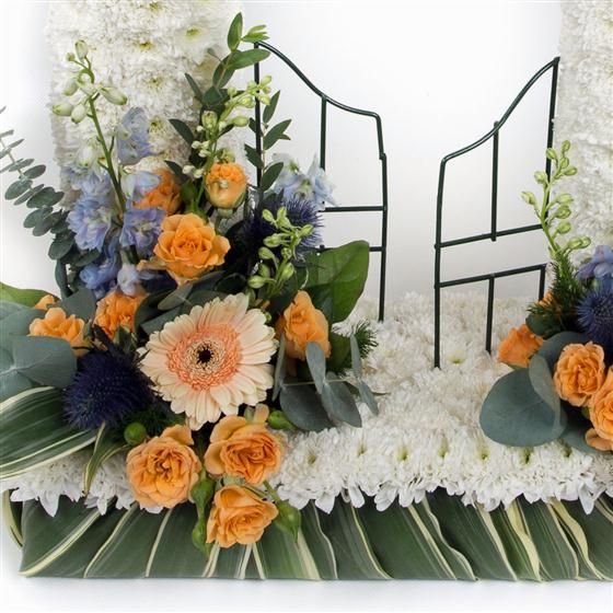 A massed tribute of white chrysanthemums with sprays available as pictured, in peaches and blues, or in your choice of colour.