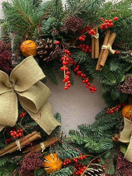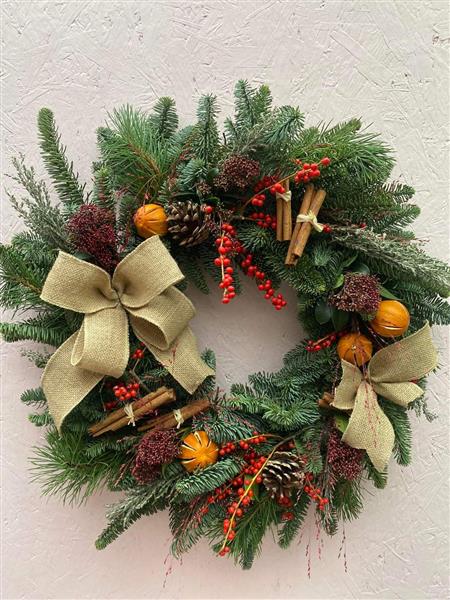 Festive natural door ring which can be made in different colour options. Dressed beautifully with cinnamon sticks, oranges, fresh berries and a lovely hessian ribbon. A must to dress your front door for Christmas time.
