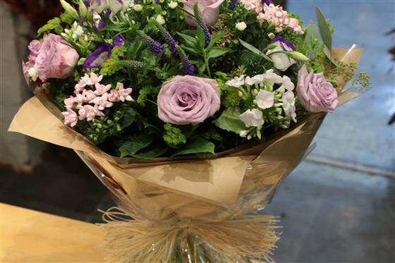 A vintage look hand tied bouquet in lilacs and purples including roses, phlox, bouvardia, veronica and lisianthus.