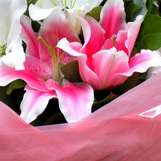 A hand tied bouquet of the finest oriental lilies. Beautifully arranged with seasonal foliage this heavily scented long lasting bouquet is sure to please. Please note that lilies are sent out in bud to guarantee a long vase life.