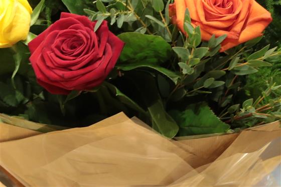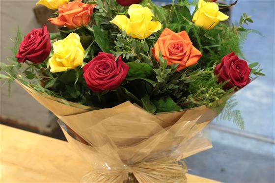 A mixed bouquet of gold, orange and red roses presented with a selection of foliage including eucalyptus and asparagus fern.
