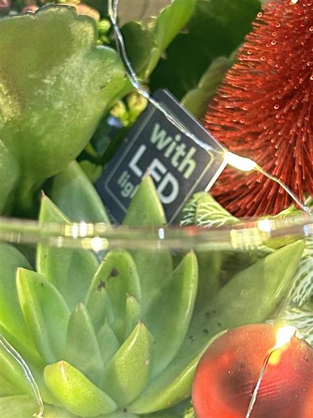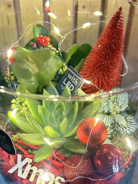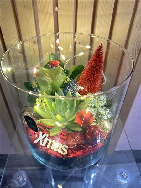 A glass cyclinder planter filled with lots of Xmas plants and decorations, finished off with its very own set of lights.