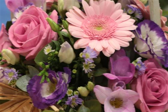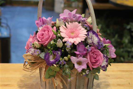 A versatile pink and lilac basket arrangement of mini pink gerberas, September flowers, freesias, roses and lisianthus.