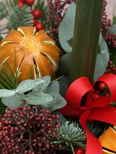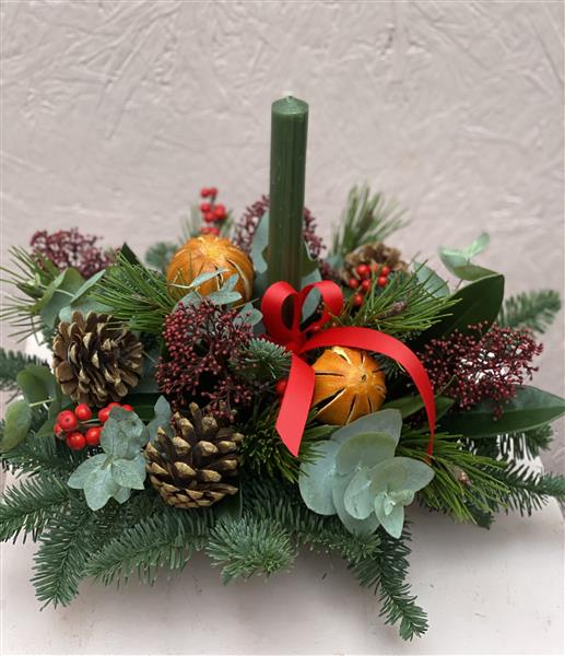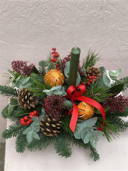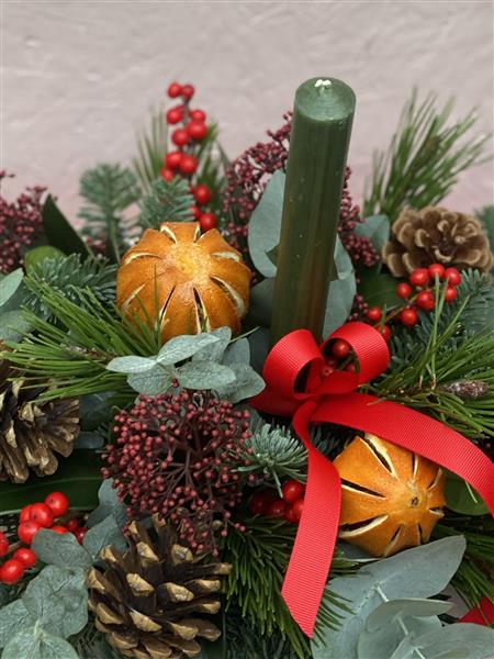 Simplicity at its best. Round table centre with the scent of xmas foliage and natural green candle. Will dress any table beautifully for Christmas Day